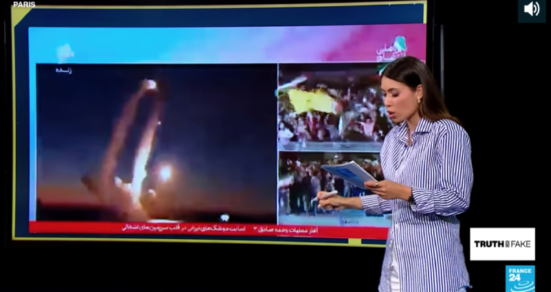 تحقیقات شبکه تلویزیونی فرانس ۲۴ نشان داد که دستکم دو تصویر که در شبکههای رسمی نشان داده شدهاند، جعلی بودهاند: همان روزی که اولین واکنش ایران تحت عنوان «وعده صادق ۳» شروع شد، شبکه یک ایران صحنههایی از پرتاب موشکهایی را نشان داد که میگفت اینها موشکهای ایران هستند.