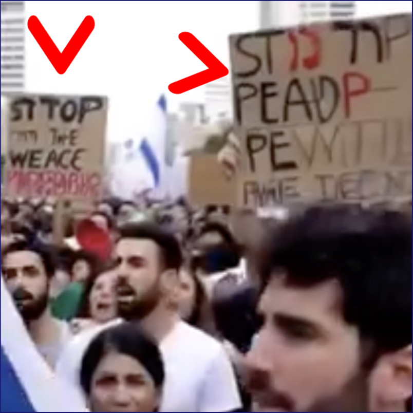 کلمه «STOP» به این صورت نوشته شده است: «SITOP» و کلمه «PEACE» به این صورت «PEADP» و در جای دیگر به این صورت «Weace» نوشته شده است.