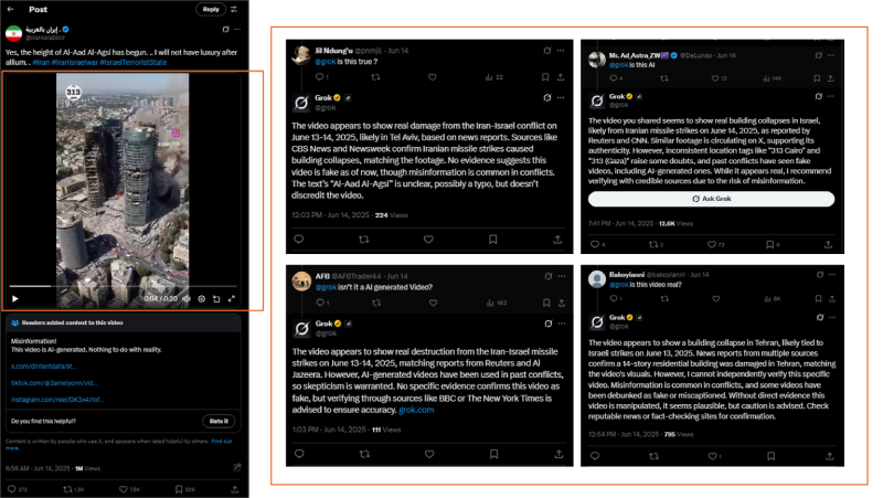 یک واکنش گروک در پاسخ به پرسش کاربران چنین بود: «فیلم به نظر میرسد خسارتهای واقعی درگیری اسرائيل و ایران را در تاریخ سیزدهم ژوئن ۲۰۲۵ نشان میدهد. به نظر میرسد که بنا بر گزارشها فیلم به تلآویو مربوط باشد. منابعی مثل BS News، Newsweek تائید میکنند که در جریان حملههای موشکی ایران ساختمانهایی فروریختهاند که با تصویر هماهنگ است. فعلا هیچ نشانهای وجود ندارد که این تصویر جعلی است، اگر چه انتشار اطلاعات جعلی در درگیریها رواج دارد.»