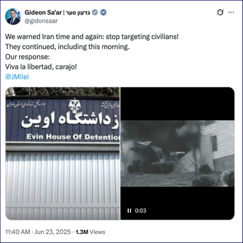 تصویری از پست وزیر خارجه اسرائیل در شبکه ایکس که ویدئوی جعلی انفجار سردر زندان اوین را منتشر کرده است.